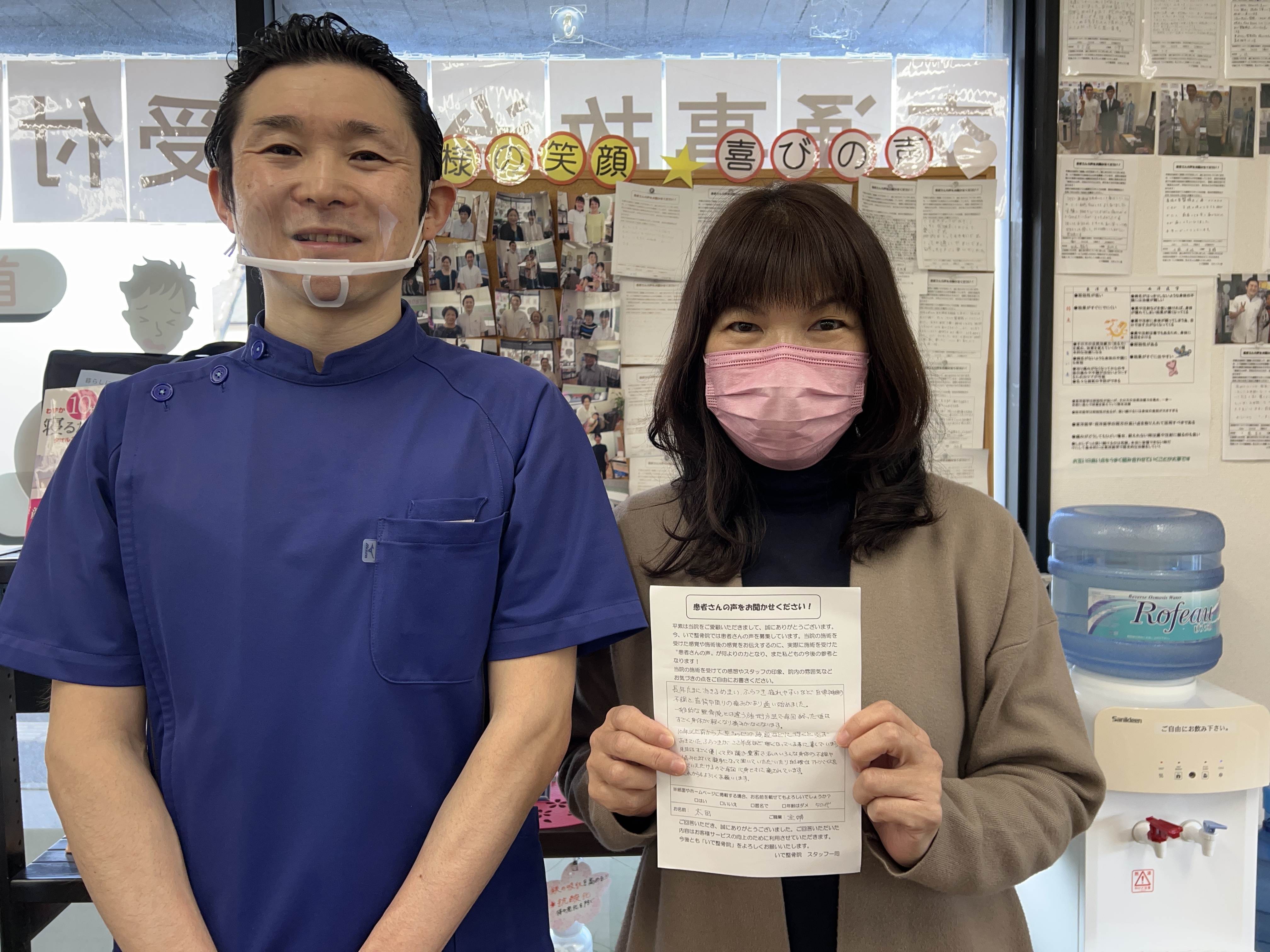 Q、当院の特徴や良い点などありますか? A、先生方がとても良い方でアットホームな雰囲気がとても気に入っている。私の場合は仕事の愚痴も聞いてもらえて、心身ともにすっきりして帰宅できる。皆さんや職場の同僚にもおすすめしたいと思っている。施術も心地よくて、時々寝てしまうこともあるくらいで、力加減も揉まれているというか擦ってもらっている感じが心地よく、元気になれる。
